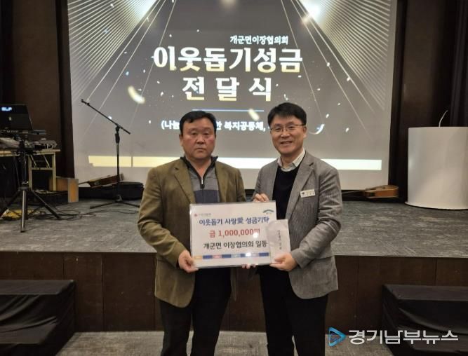 [경기남부뉴스 김혜숙 기자] 양평군 개군면은 새해를 맞아 개군면 이장협의회가 지역 내 어려운 이웃을 돕기 위해 성금 100만 원을 기탁하며 따뜻한 나눔을 실천했다고 밝혔다. 기탁된 성금은 개군면 내 취약계층을 위한 복지 지원에 사용될 예정이다.