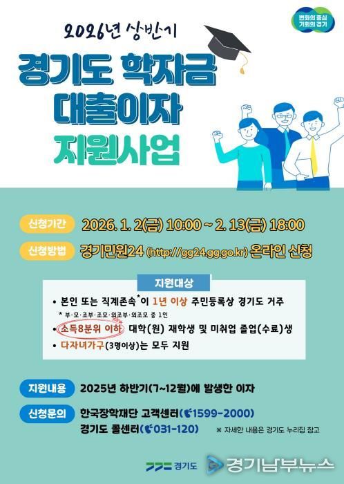 [경기남부뉴스 김혜숙 기자] 경기도가 오는 2월 13일까지 ‘2026년 상반기 경기도 대학생 학자금 대출이자 지원사업’ 신청자를 접수한다.