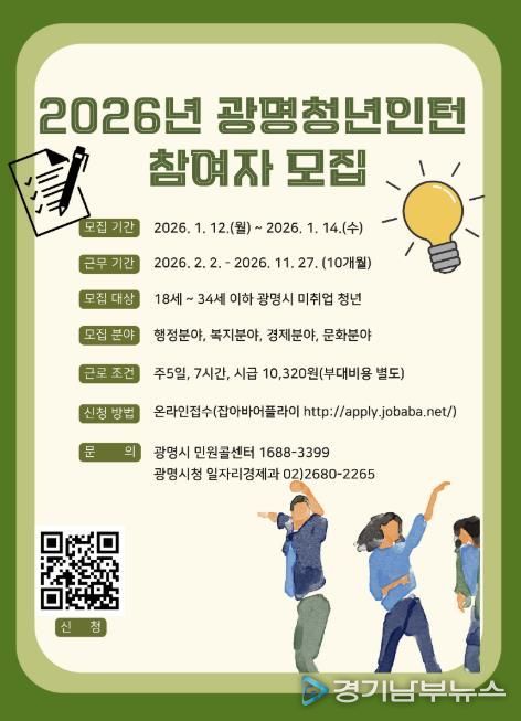 [경기남부뉴스 김혜숙 기자] 광명시가 오는 12일부터 14일까지 ‘2026년 상반기 청년 일자리 사업’ 참여자 103명을 모집한다.