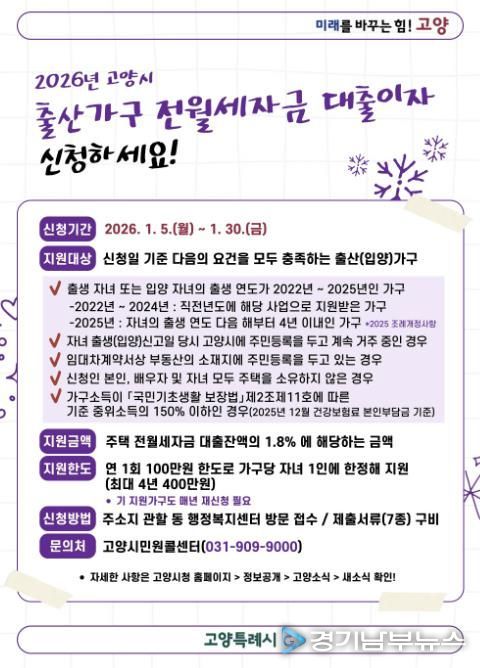 [경기남부뉴스 김혜숙 기자] 고양특례시는 무주택 출산가구의 주거비 부담을 덜어주기 위해 ‘2026년 고양시 출산가구 전월세자금 대출이자 지원 사업’ 신청을 1월 30일까지 받는다고 밝혔다.