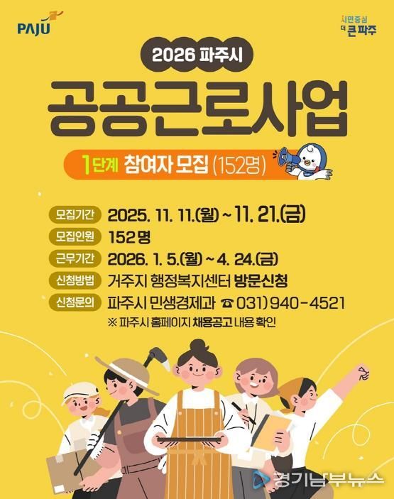 한편, 오는 5월부터 시작되는 '2026년 2단계 공공근로사업’참여자 모집은 3월 중순경 진행될 예정이며, 자세한 사항은 파주시청 누리집을 통해 확인할 수 있다.