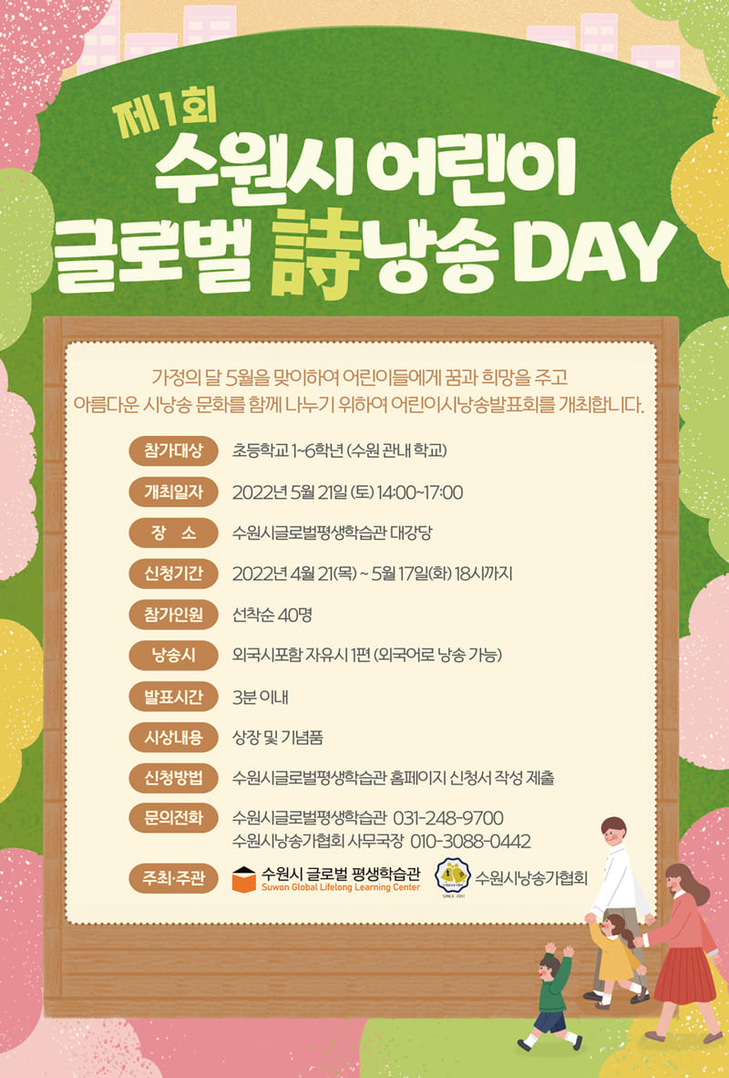 5월 21일 오후 2시 수원시글로벌평생학습관 대강당에서 열리는 ‘글로벌 시 낭송 DAY(데이)’는 어린이가 시(詩) 1편을 외워서 3분 이내로 낭송(발표)하는 행시다. 자작시를 제외한 한국어·외국어 시를 자유롭게 선택해 낭송하면 된다.