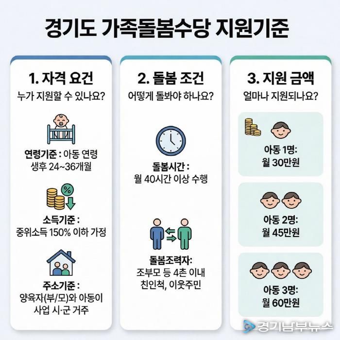 신청은 매월 1일부터 15일까지 경기민원24를 통해 온라인으로 가능하며, 돌봄활동 후 그다음 달에 수당이 지급된다.