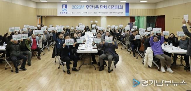 [경기남부뉴스 김정옥 기자] 지난 6일, 수원시 팔달구 우만1동 단체장협의회는 단체원 100여 명이 참여한 가운데 우만1동 행정복지센터 3층 대회의실에서 단체 간 화합과 역량 강화를 위한 ‘2026 우만1동 단체 다짐대회’를 개최했다.