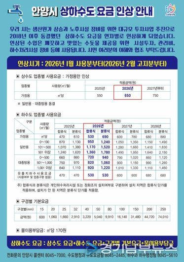 [경기남부뉴스 김혜숙 기자] 안양시는 상하수도 생산원가 상승과 노후 시설 정비를 위한 대규모 투자 재원 확보를 위해 2026년 1월 사용분(2월 고지분)부터 상하수도 요금을 인상한다고 11일 밝혔다. 이번 인상은 고물가 상황 속에서 시민들의 경제적 부담을 최소화하기 위한 ‘단계적 현실화 계획’에 따른 것이다.