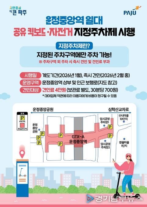 [경기남부뉴스 김혜숙 기자] 파주시는 운정중앙역 일대의 보행자 안전을 확보하고 공유 이동장치의 무분별한 방치를 해소하기 위해 운정중앙역 상부와 인근 보행로를 대상으로 공유 이동장치 ‘지정주차제’를 시행한다고 12일 밝혔다.