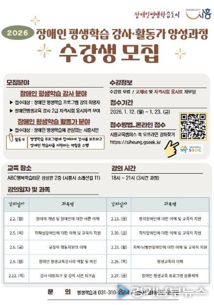 [경기남부뉴스 김혜숙 기자] 시흥시는 오는 1월 23일까지 ‘2026년 장애인 평생학습 전문 강사와 활동가 양성 과정’ 수강생을 모집한다.