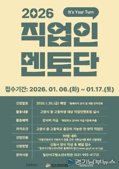 [경기남부뉴스 김혜숙 기자] 고양시청소년재단 일산서구청소년수련관이 청소년들의 진로 탐색·설계를 지원하기 위한 ‘2026 직업인멘토단’을 모집한다고 밝혔다.
