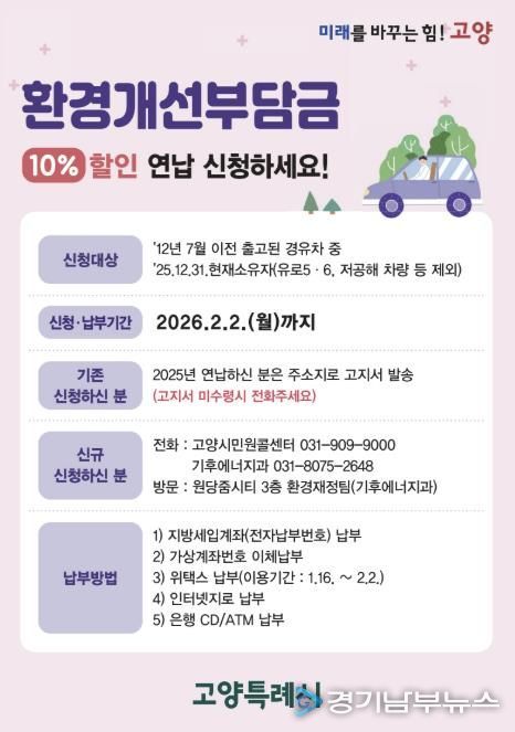 [경기남부뉴스 김혜숙 기자] 고양특례시는 노후 경유차 소유자를 대상으로 한 ‘2026년도 환경개선부담금 연납 제도’를 운영하며 오는 2월 2일까지 신청받는다고 밝혔다.