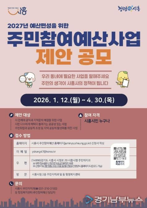 [경기남부뉴스 김혜숙 기자] 시흥시는 오는 4월 30일까지 주민들이 직접 사업을 제안하는 ‘시흥시 주민참여예산 제안’을 신청받는다.