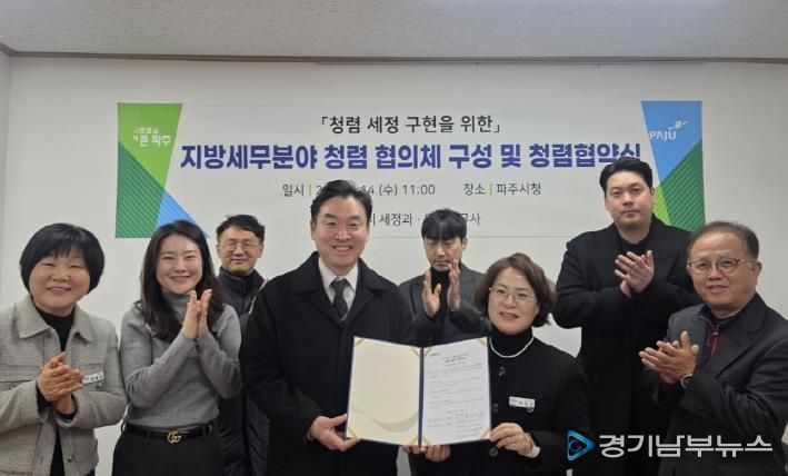[경기남부뉴스 김혜숙 기자] 파주시는 지난 14일 파주지역세무사회(마을세무사)와 함께 청렴 문화의 정착과 확산을 위한 민관 청렴협의체를 구성하고, 청렴 실천을 위한 협약을 체결했다고 밝혔다.