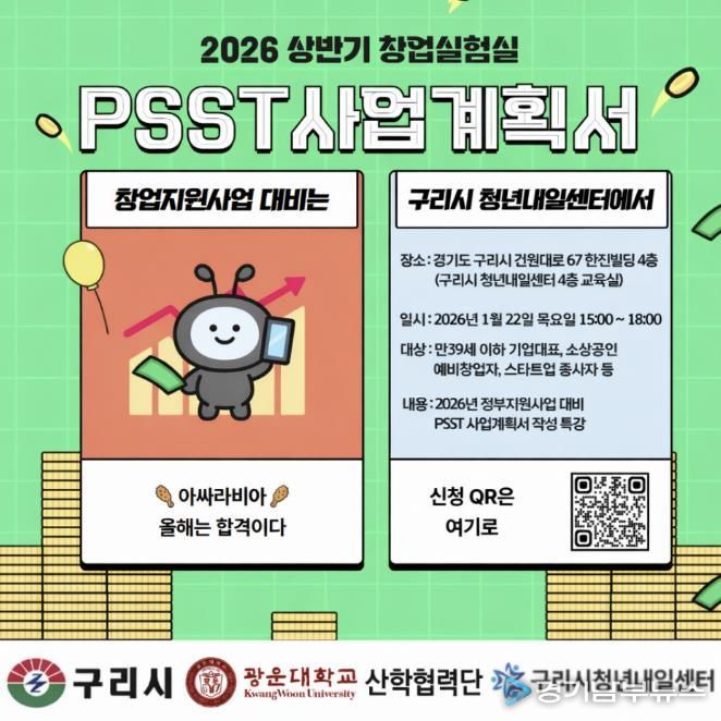 이번 프로그램은 2026년 대형 정부 창업지원 사업을 대비한 PSST 전략 사업계획서 작성 특강으로, 실질적인 창업 역량 강화를 목표로 기획됐다. 특강은 1월 22일(목) 오후 3시부터 6시까지 운영되며, 관내 청년 예비창업가와 기업 대표, 소상공인 등을 대상으로 사업계획서 작성 비법과 맞춤형 조언을 중심으로 한 실전형 교육으로 진행될 예정이다.