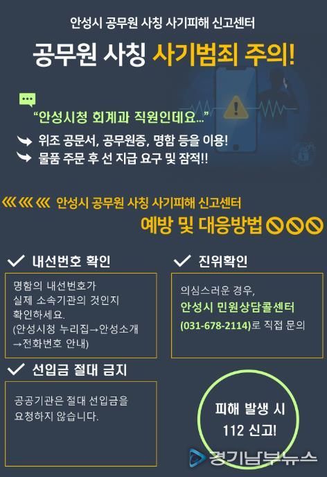 안성시 관계자는 “안성시 공무원은 어떠한 경우에도 선입금을 요구하지 않는다”며 “수상하거나 의심스러운 연락을 받았을 경우, 즉시 신고센터로 문의해 달라”고 당부했다.