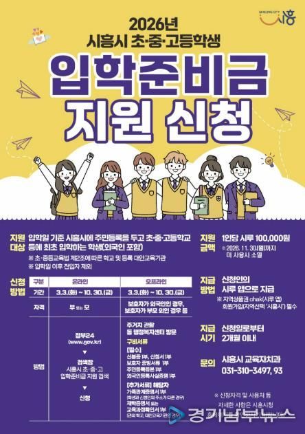 [경기남부뉴스 김혜숙 기자] 시흥시는 올해부터 관내 초중고 입학 자녀 가정에 입학준비금을 10만 원씩 지원한다. 이번 지원은 도서나 문구류 등을 새로 마련해야 하는 신입생 가정의 경제적 부담을 줄여주고, 교육 기본권을 강화하고자 추진됐다.