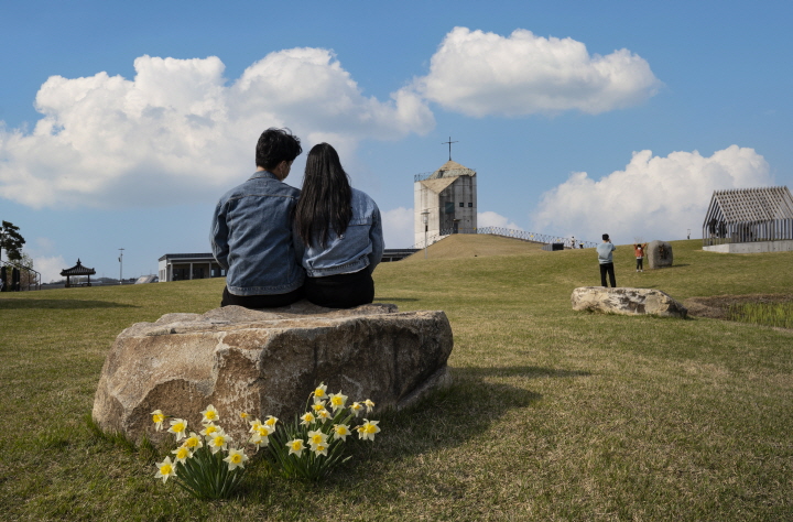 작품 속의 배경은 충남 당진의 신리성지이다. 고즈넉한 잔디밭에 평화로이 뛰어노는 아빠와 아들이 보이고 미래의 가족을 꾸려놓을 연인들의 모습도 보인다. 노란 수선화가 활짝 핀 돌 위에 사랑스러워보이는 두 명의 학생이 다정히 앉아 이야기를 나누고 있다. 뒷모습만 촬영하겠다는 양해를 구하고 찰칵!! 스냅으로 촬영한다. 앞으로도 이쁜 사랑하며 평생연인으로 행복한 가정을 이뤘으면 하는 바램으로 그들의 휴대폰으로도 찍어주었다.