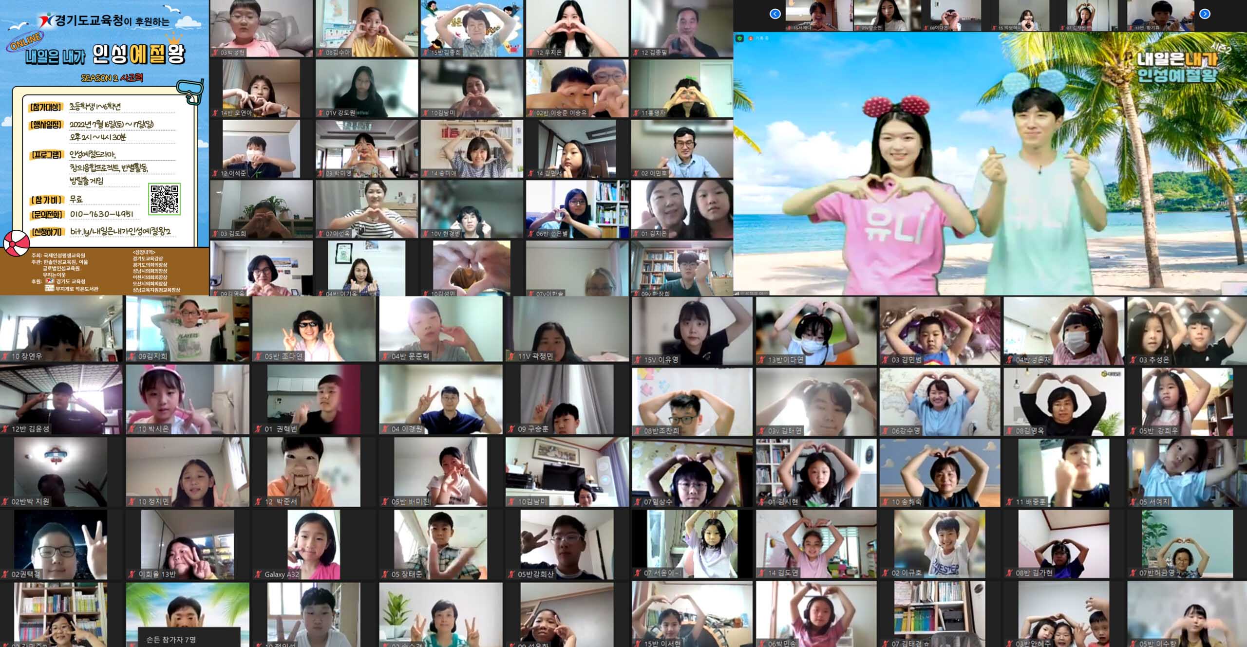 경기도 교육청이 후원하고 국제인성평생교육원이 주최하는 ‘내일은 내가 인성 예절 왕’ 시즌2가 7월 16일~17일 양일간 오후 2시부터 4시 반까지 400여명이 참석한 가운데 줌에서 개최됐다.