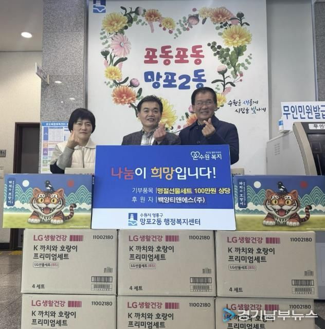 [경기남부뉴스 김정옥 기자] 영통구 망포2동 행정복지센터는 지난 3일 백양티앤에스(주)가 설 명절을 맞아 100만 원 상당의 명절 선물세트를 망포2동 취약계층을 위해 기탁했다고 밝혔다.