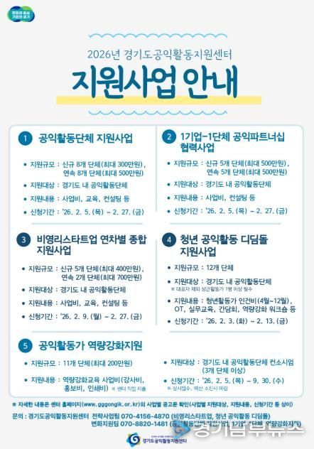 [경기남부뉴스 김혜숙 기자] 경기도공익활동지원센터가 ‘2026년 경기도 공익활동 지원사업’에 참여할 도내 공익활동 단체를 모집한다.