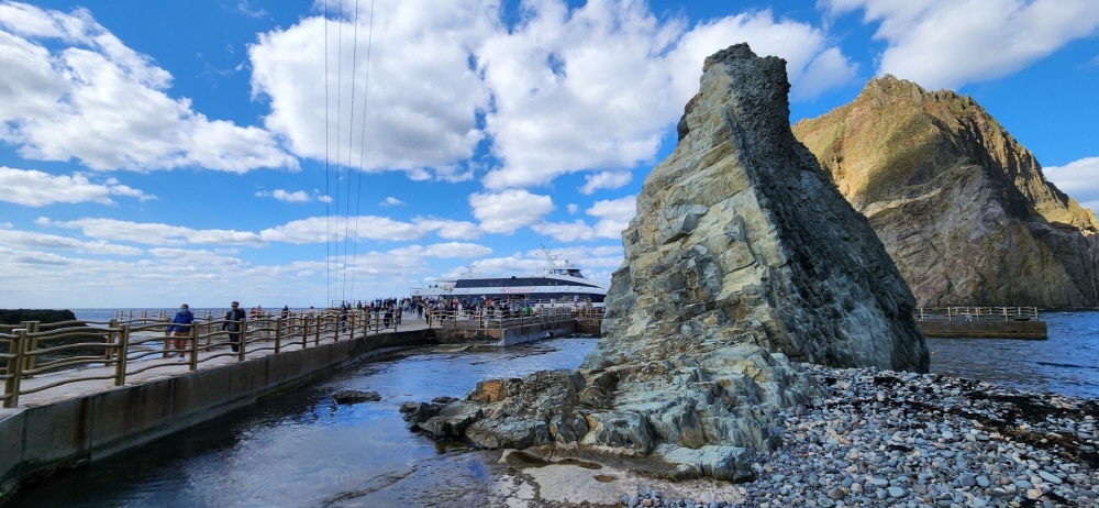 10월 29일 이른 새벽부터 절세가경 울릉도 육로관광을 진행하고 10시에 독도 출항~ 너울성 파도가 심하다는 안내 방송을 듣자 많은 이들이 “독도 땅을 밟지 못하고 주변만 둘러 보고 오겠네” 하며 아쉬운 말들을 한다. 옆 사람도 많은 아쉬운 말을 하길래 “걱정, 염려 갖다 버려요.독도 땅을 밝을 수 있으니”... 배에 오른지 2시간만에 독도 입항을 성공한다. 주어진 시간이 30분이라 그 안에 태극기를 휘날리며 기념 사진을 한컷 찍었다.