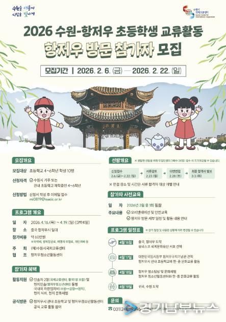[경기남부뉴스 김정옥 기자] 수원특례시는 ‘2026 수원–항저우 초등학생 상호방문교류’에 참여할 초등학생 10명을 2월 22일까지 모집한다.