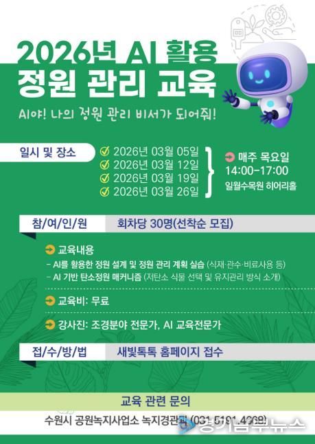 생성형 인공지능(AI) 교육 전문가와 조경·정원 분야 전문 강사진이 이론과 사례를 중심으로 강의한다. 수강을 원하는 시민은 수원시 시민참여 플랫폼 ‘새빛톡톡’에서 신청하면 된다. 선착순 모집이다.