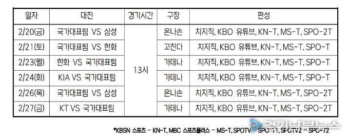 [경기남부뉴스 김혜숙 기자] 3월에 열리는 월드베이스볼클래식(이하 WBC)에 대비해 일본 오키나와에 훈련 캠프를 차리는 대한민국 국가대표팀의 평가전 일정과 중계가 확정됐다.