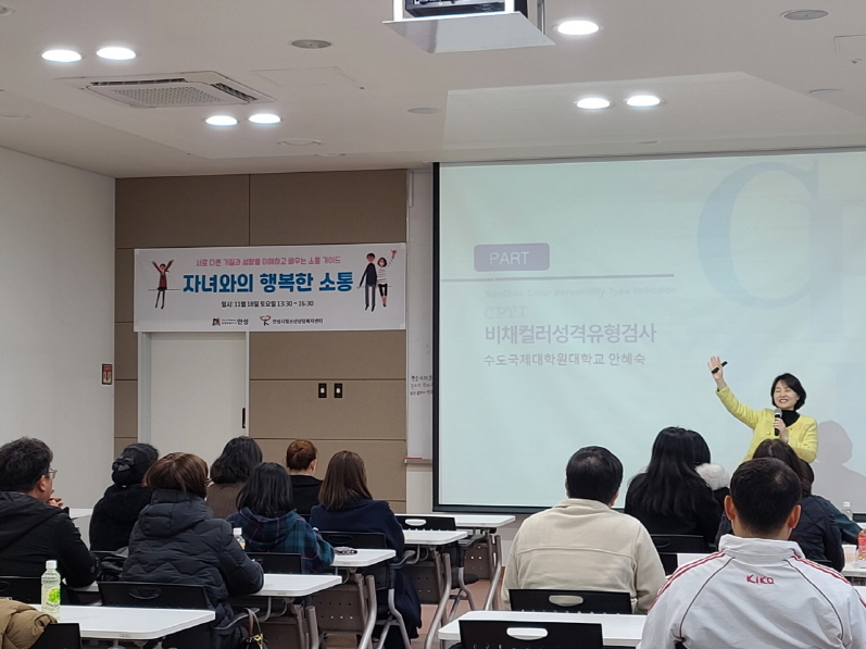 안성시 청소년 상담복지센터는 지난 18일에 자녀와의 행복한 소통이라는 주제로 부모 교육을 진행하였다. 이날 교육은 한국 예술 심리상담협회 안혜숙 소장의 강의로 진행되었는데, 안혜숙 소장은 컬러 성격유형에 따른 부모-자녀 각자만의 컬러가 갖는 특성과 에너지 방향 이해를 통한 소통 가이드를 제시하였다.