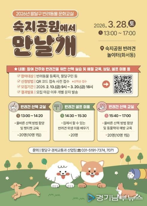 [경기남부뉴스 김정옥 기자] 수원시 팔달구는 오는 3월 28일 13:00~17:00 화서동 소재 숙지공원 내 반려동물 놀이터에서 ‘2026년 팔달구 반려동물 문화교실’을 개최한다고 밝혔다.