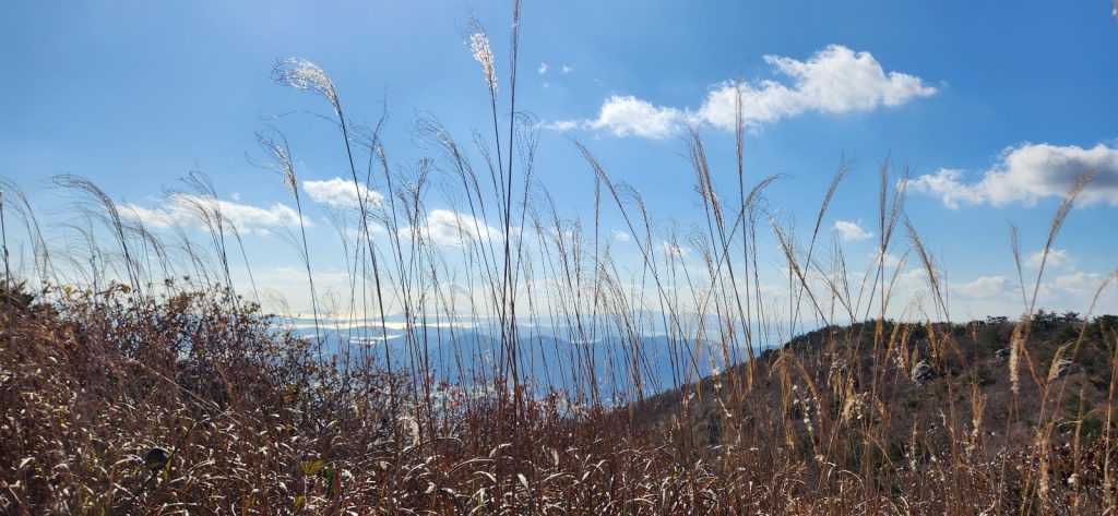 진죽붕에 이어 구룡봉으로 가는 내내 끝물인 억새길을 따라 걸었다. 앞으로는 구룡봉과 다도해 그리고 크고 작은 산들, 섬들, 맑은 하늘과 찬란한 햇살 및 구름, 바람이 너무 아름다운 장관을 연출하고 있었다.