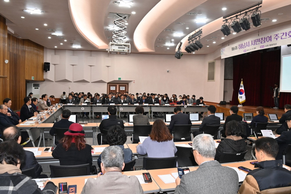 하남시(시장 이현재)가 27일 시청 본관 대회의실에서 열린‘제6회 시민참여 주간회의’에서 올해 시민 편익 증진을 위해 실시한 주요 사업추진 결과를 보고하고, 내년도 사업추진 방향과 관련한 시민 의견을 청취했다.