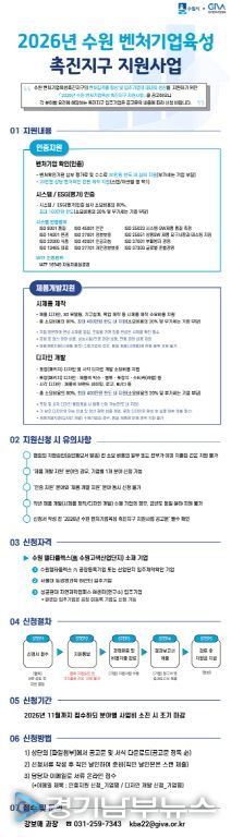 [경기남부뉴스 김정옥 기자] 수원특례시가 수원 벤처기업육성촉진지구 내 중소·벤처기업을 대상으로 인증과 제품 개발을 지원하는 ‘2026년 수원 벤처기업육성촉진지구 활성화사업’에 참여할 기업을 모집한다.