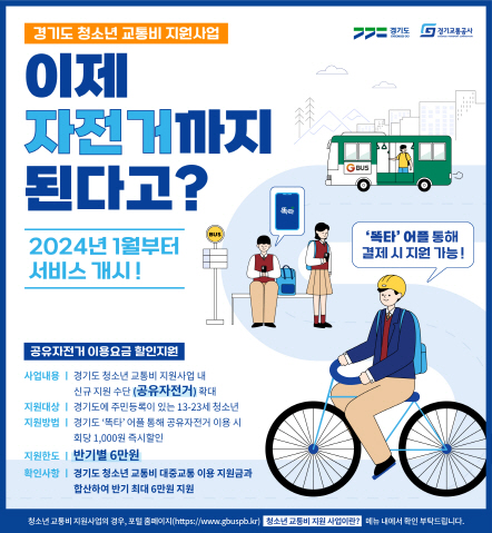 한편, 경기도는 2020년부터 ‘청소년 교통비 지원사업’을 통해 도내 청소년이 대중교통 이용 시 연간 최대 12만 원을 지원하고 있다.