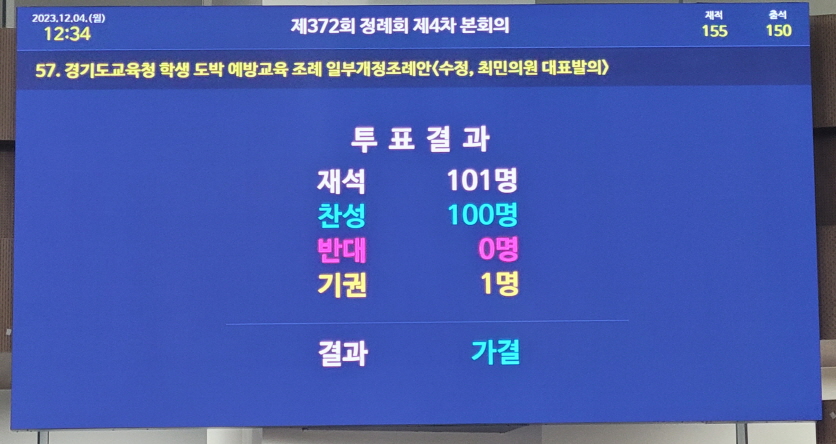 또한, 최 의원은 “온라인게임과 사이버도박 경계가 모호해지면서 청소년 도박 중독 환자가 급격히 증가해도, 경기도교육청은 2023년 학생 도박 예방 교육 예산을 미편성하는 등 소극적으로 대처하고 있었다”고 말했다. 이어서, “도정질문을 통해 교육감에게 해당 문제의 심각성을 촉구하는 한편, 조례를 개정하여 사이버도박을 정의하고, 단순 도박 중독 예방 교육을 시행할 뿐 아니라, 학생들이 전문 상담 및 치료를 받을 수 있는 제도적 토대를 마련하고자 했다”고 조례 개정 취지를 밝혔다.
