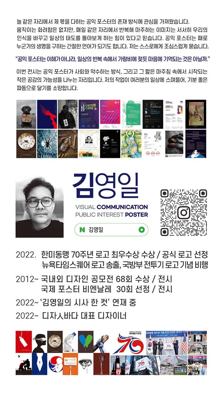 이번 전시는 공익 포스터가 사회와 악수하는 방식, 그리고 그 짧은 마주침 속에서 피어나는 작은 공감의 가능성을 나누는 자리입니다. 저의 작업이 여러분의 일상에 스며들어, 기분 좋은 파동으로 닿을 수 있기를 소망합니다.
