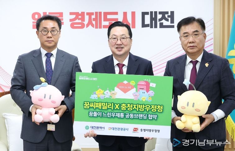 [경기남부뉴스 김혜숙 기자] 대전시는 6일 시청 10층 응접실에서 대전관광공사, 충청지방우정청과 함께 ‘꿈돌이 느린우체통’ 사업 추진을 위한 공동브랜딩 업무협약을 체결했다.