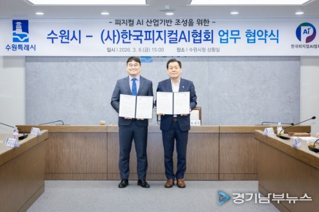 [경기남부뉴스 김정옥 기자] 수원특례시와 (사)한국피지컬에이아이(AI)협회는 6일 시청 상황실에서 업무협약을 체결하고, 피지컬 인공지능(AI) 산업 활성화를 위해 적극적으로 협력하기로 했다.