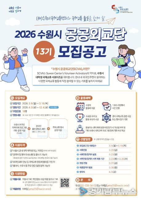 [경기남부뉴스 김정옥 기자] 수원시국제교류센터가 ‘2026 수원시 공공외교단(SCVA) 13기’를 3월 19일까지 모집한다.