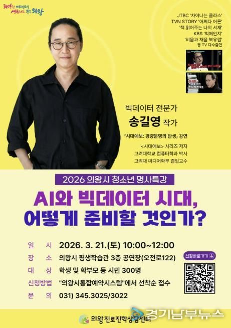 [경기남부뉴스 김혜숙 기자] 의왕시 진로진학상담센터가 3월 21일 오전 10시, 의왕시 평생학습관(오전로 122)에서 청소년과 시민을 대상으로 '2026 상반기 청소년 명사특강'을 개최한다.