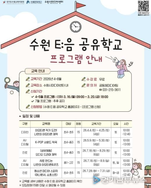 수원시미디어센터는 ‘2026년 수원 E:음 공유학교’ 지역맞춤형 기관 연계 프로그램 운영 기관으로 선정되어, 오는 4월부터 디자인, 사운드, 스피치 등 다채로운 미디어 교육을 본격 가동한다.