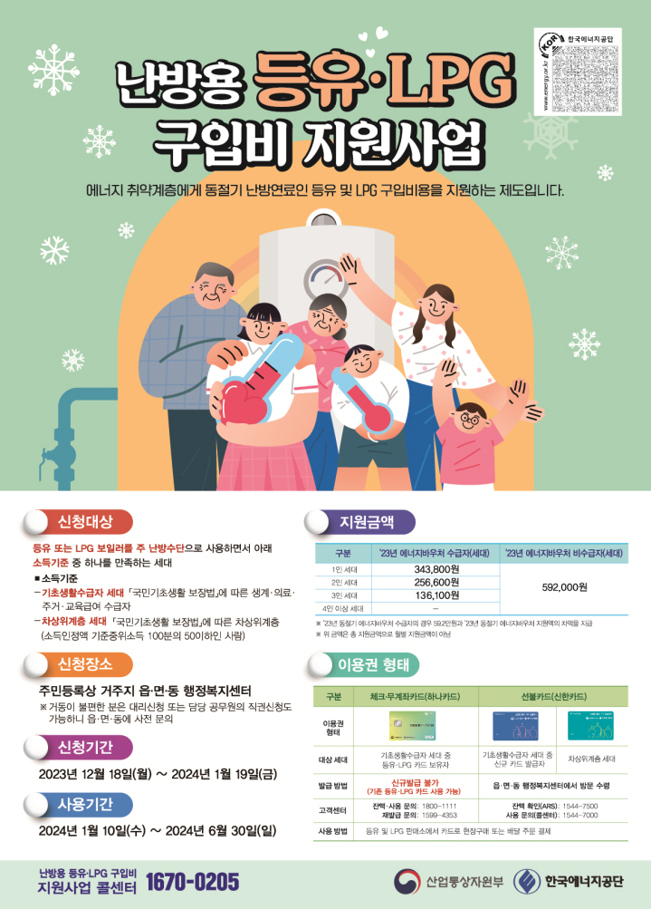 지원받은 난방비는2024년1월10일~6월30일까지 등유·LPG판매소에서 카드도 현장 구매 또는 배달 주문 결제할 수 있다. 지원 한도액 범위에서 분할 결제할 수 있고, 잔액은 현금으로 받을 수 없다. 난방용 외 차량 연료 등 다목적 유류·가스 구매에 사용할 수 없다.