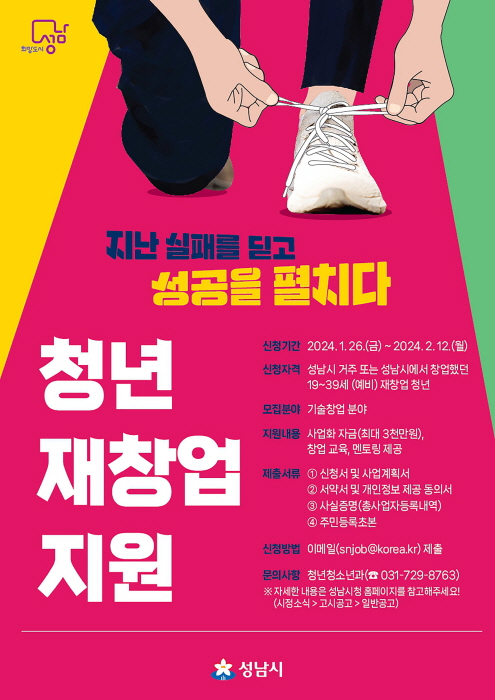 지원 규모는 7개 팀(명)이다. 참여 자격은 성남시에 거주하거나 지역에 창업한 적이 있는 19~39세의 예비 재창업자와 1년 이내 재창업자다. 팀의 경우 인원수 제한은 없다.