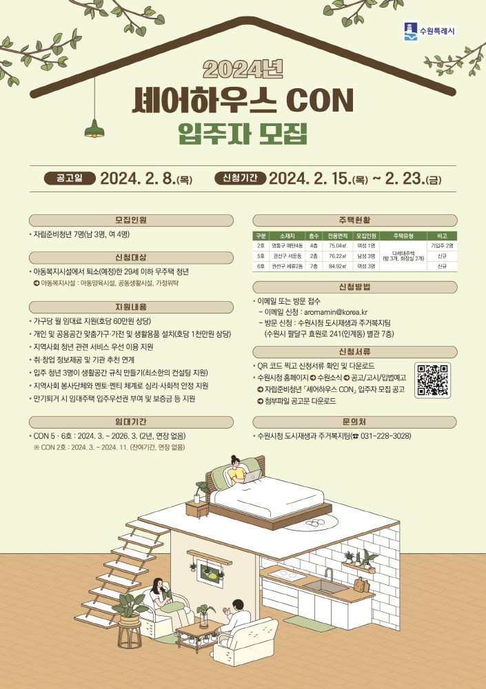 자립준비청년 셰어하우스 CON 입주청년 모집 홍보물수원시(시장 이재준)가 ‘자립준비청년 셰어하우스CON’에 입주할 자립준비청년 7명을 2월 15일부터 23일까지 모집한다.