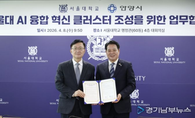 [경기남부뉴스 김혜숙 기자] 안양시는 미래 혁신산업 거점 도시로 도약하기 위한 인공지능(AI) 연구단지 조성 및 서부선 연장 추진을 위해 서울대(총장 유홍림)와 손을 맞잡았다.
