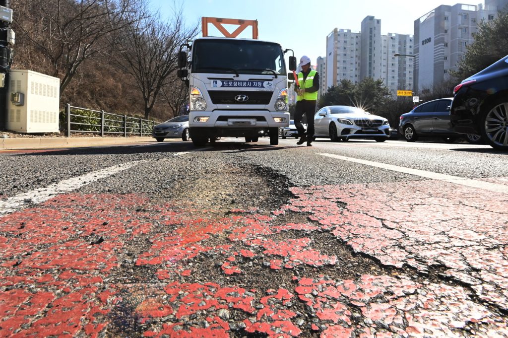 한 아파트 단지 앞 사거리에서는 포트홀 정비 작업을 수행하는 유지관리업체 직원들이 작업을 하였다. 작업 시간은 약 3분으로, 길이 1m, 폭 30㎝, 깊이 3㎝ 정도의 포트홀을 신속하게 정비했다. 이를 통해 도로는 매끈해지고 차량 통행이 재개되었다. 작업반장 권영광씨는 “비나 눈이 많이 내린 다음 날에 포트홀 발생 신고가 많이 들어온다”고 언급하며, “큰 포트홀은 한 시간 이내에 출동하고 작은 포트홀은 차량 통행량이 적은 시간에 정비해 시민들의 불편을 최소화한다”고 말했다.