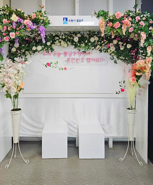 구는 봄철을 맞아 종합민원실 내 ‘혼인신고 기념 포토존’을 새롭게 단장 해 ‘우리 오늘 팔달구청에서 혼인신고 했어요’라는 문구에 화사한 장식을 했다. 또한 화관, 부케를 소품으로 이용할 수 있게 준비해 놓았다.