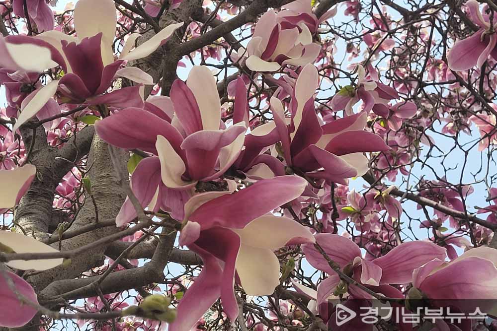 올해는 목련과 벚꽃이 동시에 만개해 등산객들에게 색다른 봄을 선사하고 있다.