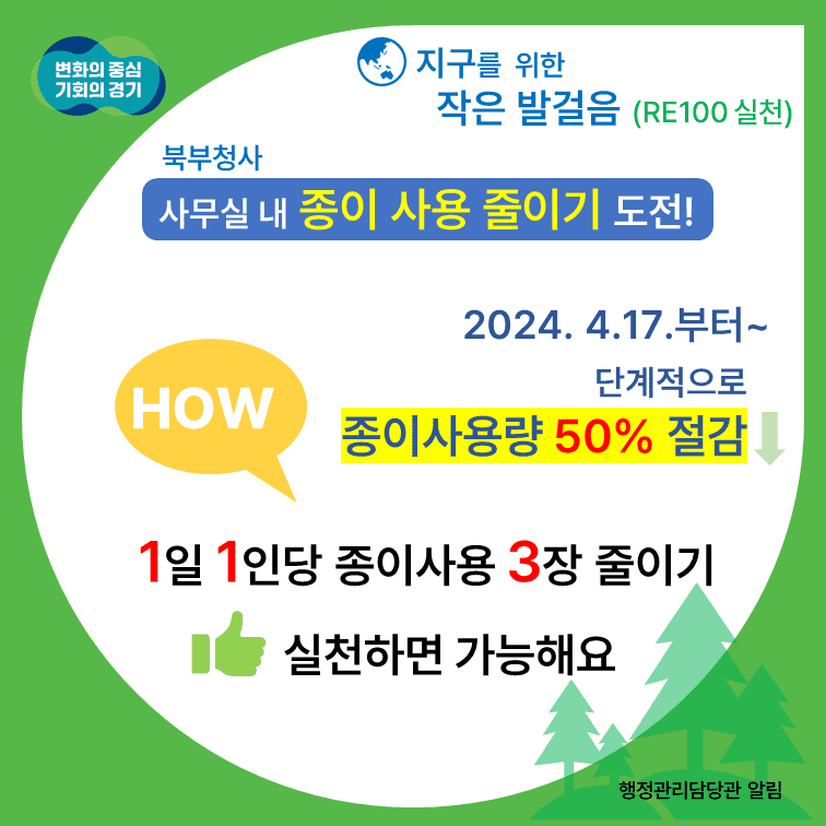 변상기 경기도 행정관리담당관은 “RE100 실천을 위한 이번 캠페인을 통해 사무실 내 1일 1인당 종이 사용 3장 줄이기 문화를 정착시키고, 환경보호에 대한 인식을 개선해 나가겠다”며 “경기도는 지속 가능한 미래를 위한 작은 발걸음부터 내딛겠다”고 말했다.