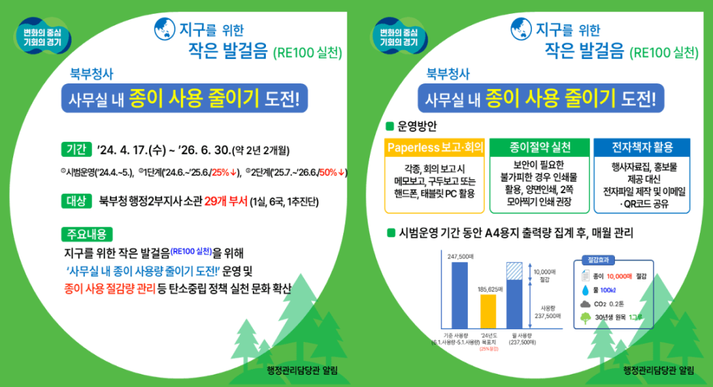 북부청사는 탄소 배출량 감소를 위해 ‘1인당 1일 종이 사용량 3장 줄이기’ 를 통해 2026년 6월까지 종이 사용량을 50% 줄이는 목표를 설정했다.