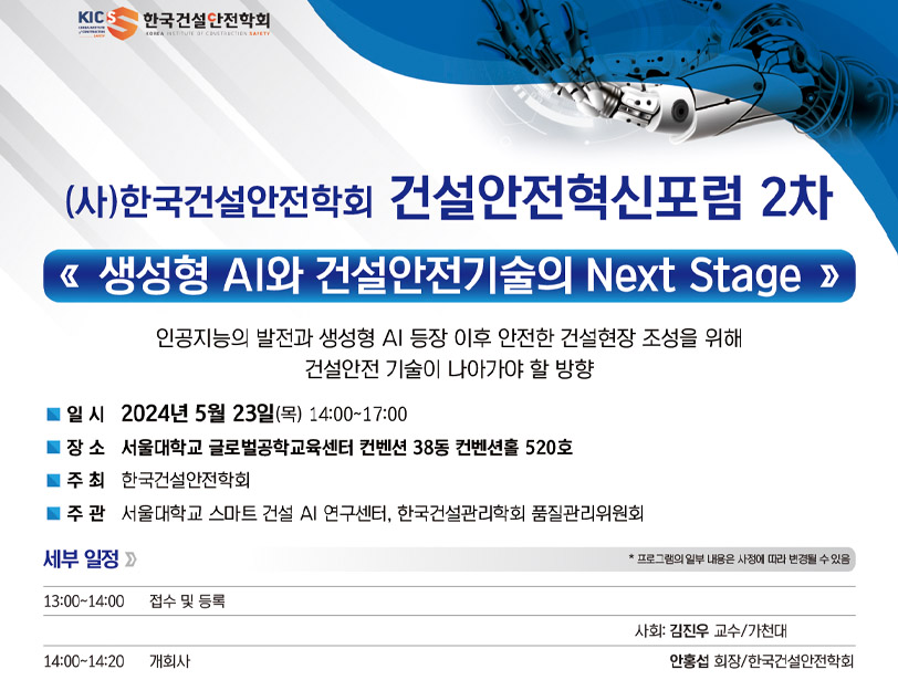 5월 23일(목) 오후 2시부터 7시까지 열리며 서울대학교 스마트건설 AI연구센터와 한국건설관리학회 품질관리위원회가 주관한다.