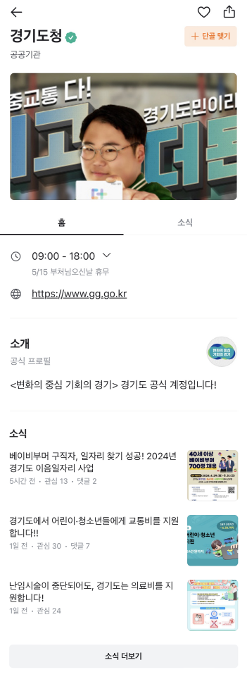 사용자가 '경기도'를 활동 지역으로 설정할 경우, '동네생활'이나 '내 근처' 게시판에서 새롭게 올라온 도정 소식을 확인할 수 있다. 특히 공공프로필과 ‘단골 맺기’를 하면 알림을 받게 돼 보다 빠르게 경기도 소식을 확인할 수 있으며 댓글로 소통도 가능하다.